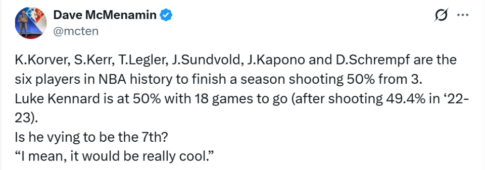 另外,NBA历史上目前只有6位曾经单赛季三分命中率达到至少50%的球员。他们是科沃尔、科尔、莱格勒、桑德沃尔德、卡波诺、施拉姆夫。肯纳德目前三分命中率50%,本赛季还剩18场比赛(他2022‑23赛季命中率为 49.4%)。他会成为历史第 7 人吗?